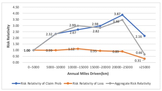 Risk relativities by grouped Annual Mileage Driven based on loss severity, frequency, and loss cost (aggregate risk), respectively.