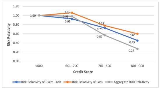 Risk relativities by grouped Credit Scores based on loss severity, frequency, and loss cost (aggregate risk), respectively.