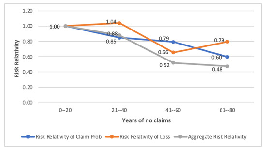 There are two steps in deriving risk relativity. First, we fit the data after regrouping for each individual observation to GLM (i.e., logistic regression) using claim frequency as a response for the model to obtain the coefficient of the ith factor at the jth level, denoted by . We then repeat the same procedure by changing the response variable to claim severity, which is the claim amount, to obtain , which is the coefficient of the ith factor and jth level. If a level has been selected as a basis in GLM, the coefficient of such a factor level is zero. Since the log link is used for both GLMs that are used to model severity and frequency, we have to transform the coefficients back to the original scale; therefore, the risk relativity of the ith factor and jth factor level becomes . If we further select the first level in each factor as the basis, the final relativity estimate is . This is to ensure that the selected factor level will have relativity to be one. To estimate relativity, we use the same set of predictors for the models we considered; although they may exist, some of them are not statistically significant in one of the models. However, this does not affect our estimate of risk relativity, as their relativities will be close to one when such a factor does not significantly impact the prediction outcome. Note that the intercept coefficients of both models will form a basis rate, which can be treated as an overall average premium for all drivers. It is equal to . So, the risk relativity at a level of a given risk factor is a modifier that is used to reflect the relative risk level when a driver falls into that category.