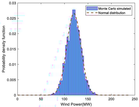 In this subsection, we study the probability distribution of wind power output based on the historical data and first use Monte Carlo sampling technology to generate wind power scenarios. Various probability distribution types of wind power have been discussed in recent years, and the multivariate normal distribution is widely used to construct the probability distribution of random wind power output [24], which can be denoted by . The probability distribution function of wind power is defined by