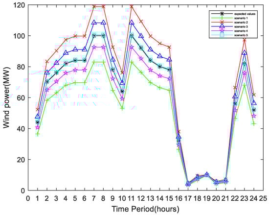 We assumed that the wind power output is subject to multivariate normal distributed, with the hourly forecasted wind power ranging between 0 and 120, which gives a standard deviation of 10% of the expected values. Then, we used Latin hypercube sampling to generate 4000 scenarios for 24 h wind power generation, and the K-means clustering algorithm was employed to classify these scenarios into five types. The corresponding wind power outputs are shown in Figure 3.