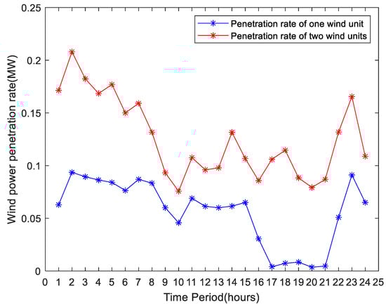 In order to ensure the safe and stable operation of a power system after wind power integration, it is necessary to study the penetration rate of wind power, which is the percentage of wind power relative to the regional grid power. The wind power penetration rates of a system with one wind unit and two wind units at different time periods are shown in Figure 5. As shown in the figure, the wind power penetration rates of a system with two wind units are much higher than those of a system with one wind unit, and the maximum wind power penetration level of a system with two wind units exceeds 20%. Despite the higher the wind power penetration rate, the lower the total cost, the more challenges faced by a power system with high penetration of wind power, owing to the high volatility and intermittency of wind power. Therefore, curtailing of wind has to be considered to ensure secure operation of the system in some circumstances from the total cost point of view.