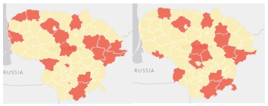 Classified Lithuanian municipalities in 2018 (left) and 2019 (right). Yellow color areas indicate municipalities with low level of mortality due to ACE (with label value 0) and red areas indicates municipalities with high level of mortality due to ACE (with label value 1).