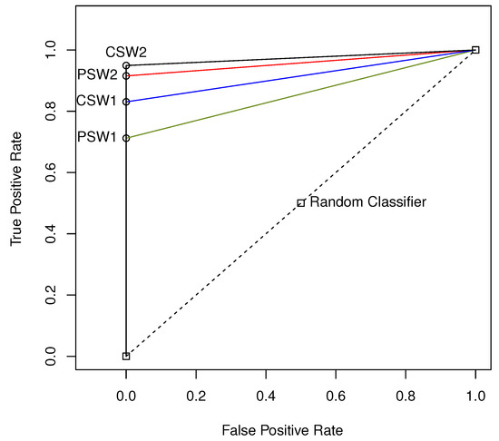 The values of performance measures for the proposed classifiers specified in Equations (6) and (7) are presented in Table 4.