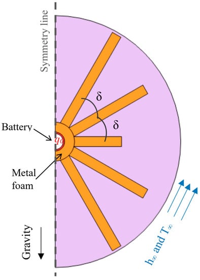 Figure 1 shows a schematic view of a battery with a heated temperature of Th covered with a NePCM heatsink. The heatsink is a cylindrical enclosure partially filled with a metal foam layer. The foam layer covered the battery section. Some fin shape metal foams are also used to improve the heat transfer in the NePCM further. The NePCM comprises 1-Tetradecanol as the host PCM and graphite nanoplatelets (GNPs) as the nanoparticles. Gravity acts in the horizontal direction, as depicted in Figure 1. The entire foam layers and remaining cylindrical space are filled by a NePCM. The inside tube of the heatsink is subject to a heat flux of power q0. The outer perimeter of the heatsink is cooled by a natural convection flow of convective heat transfer coefficient of h∞ and temperature T∞.