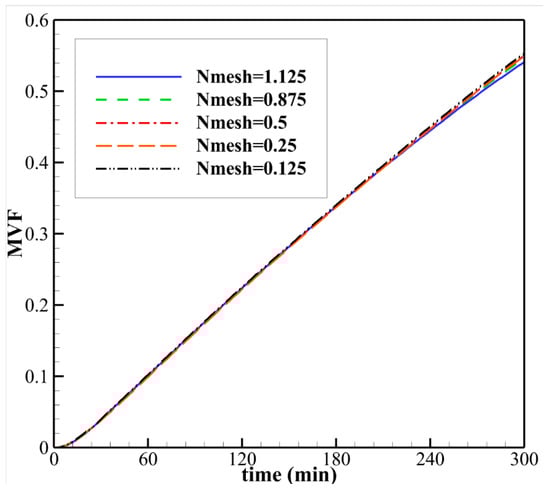 An unstructured mesh was selected to discretize the domain. The boundary layer shape meshes were used for walls to better capture velocity and temperature gradients. Mesh sensitivity analysis was performed on a case with γ = 35° and ω = 1% wt to check the effectiveness of different grid sizes on the findings. A mesh control variable, Nmesh, is introduced to control the mesh sizes. The smaller the Nmesh variable, the finer the mesh elements. Table 2 summarizes the specific features of each analyzed mesh, including the elements, edges, MVF, and heated wall average temperature after 5 h of heating. Figure 2 illustrates the impact of mesh sizes on the computed MVF in the enclosure for various Nmesh values. As seen, a mesh produced by a Nmesh value of 0.25 could provide an accurate wall temperature and also evaluate MVF with fair accuracy. As a consequence, the current study’s findings are calculated using a Nmesh = 0.25. Figure 3 shows a broad and detailed perspective of the preferred mesh.