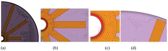 A view of utilized mesh for case Nmesh = 0.25. (a) An overall mesh view, (b) mesh details over the fins and PCM domain, (c) mesh details at the tube wall and metal foam layer, and (d) the mesh details at the fin edge and PCM domain outer wall.