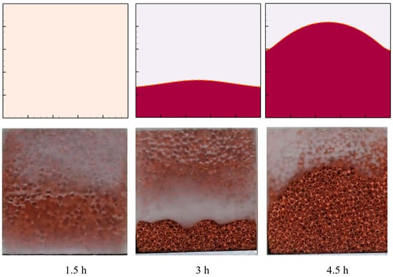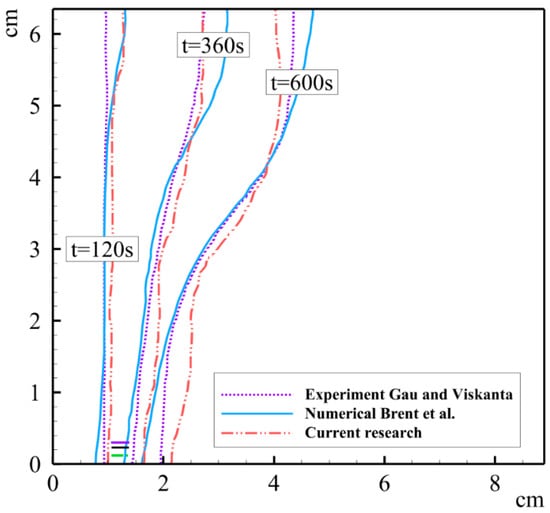 Moreover, the melting of paraffin wax in a copper metal foam, as explained in [], was simulated. The simulations were performed for melting paraffin-embedded in Cu foam (ε = 0.975) enclosed in a square container with a height of 10 cm. The PCM was heated from below. The results are reported in Figure 5. This figure also denoted fair proximity between the simulated data of the current research and [].