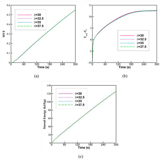 Here, four fin placement angles of 30, 32.5, 35, and 37.5° were investigated. The impact of the fin’s placement angle, δ, was addressed on MVF, surface temperature difference (Tave − Tf), and the stored energy in Figure 6. From now on, for the sake of simplicity, we call the surface average temperature difference the surface temperature.