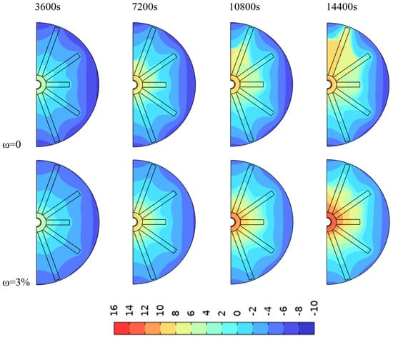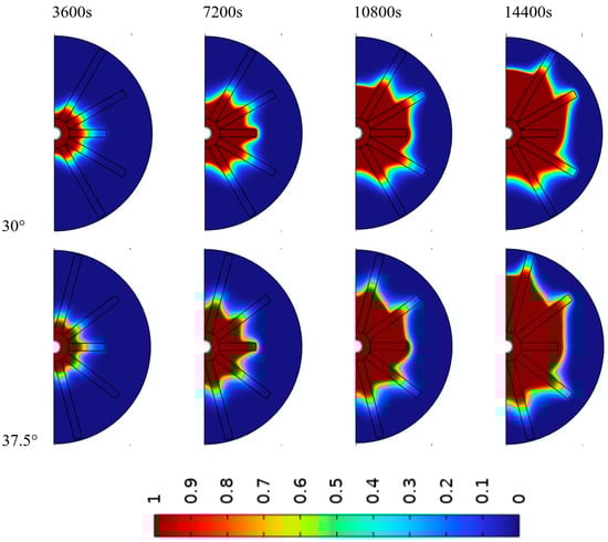 Figure 7 and Figure 8 illustrate the maps of MVF and temperature differences in the heatsink for four timesteps of one (3600 s), two (7200 s), three (10,800 s), and four (14,400 s) hours. Initially, the MVF patterns for both cases of δ = 30° and δ = 37.5° are similar. As time progresses, and since the effective thermal conductivity of the composite fins is enhanced compared to the rest of the medium, the MVF has a tendency to extend along the directions of the fins. Moreover, at the final melting times (four hours) for the case of δ = 37.5, there is a larger molten area at the top regions of the enclosure compared to the case of δ = 30°. The bottom region for both cases looks similar. The temperature patterns for both cases also show similar patterns. The most notable difference between the isotherms is at the final stages of the melting process (four hours). In the case of δ = 30°, a large plume of heated PCM (+10 °C) can be seen in the upper region of the enclosure. This is a Rayleigh–Bénard shape natural convection shape that forms toward the top cold regions of the heatsink container. In the case of δ = 37.5°, the melting interface is more advanced toward the top, and there is a larger gap between the heated surface and the top region (melting interface); thus, the heated plume is smaller.
