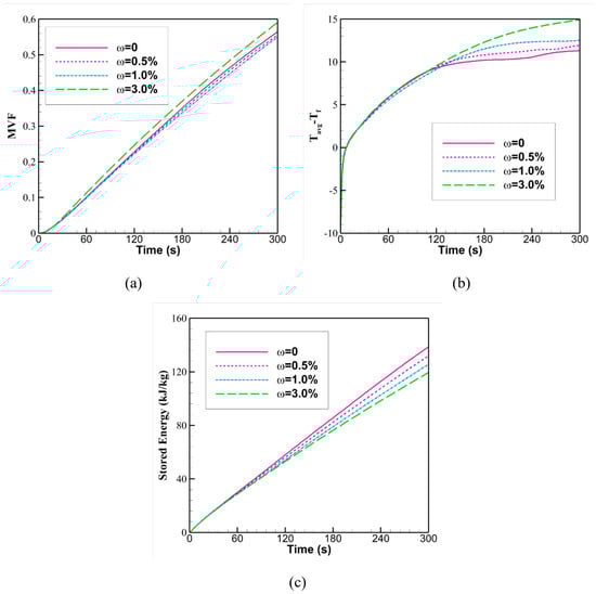 The impact of the weight fraction of GNPs (ω) on the MVF, surface temperature, and stored energy is depicted in Figure 9. With the increase of ω, the MVF rises. Indeed, the GNPs do not contribute to the phase change heat transfer, and since the amount of heat rate from the heated surface is fixed, the MVF increases. This means more NePCM should be melted to absorb the input heat from the heated surface. The amount of stored energy per unit weight of the heatsink reduces by increasing the weight fraction of nanoparticles because the GNP is much heavier than the base PCM and does not contribute to the phase change heat transfer. Thus, the heavy and low heat capacity GNPs reduced the overall normal heat capacity of the heatsink. Finally, the presence of GNP nanoparticles raises the temperature of the heated surface at final times. However, a small decrease in surface temperature in the middle of the melting process can be observed for the case ω = 1.0%. It should be noted that the heat flux at the heated surface is constant; thus, the surface temperature is directly related to the heat transfer rate. The reduction of surface temperature for ω = 1.0% could be the result of improved thermal conductivity caused by the presence of GNPs. In the initial stages of melting heat transfer, the convection heat transfer mechanisms are negligible, and conduction is the dominant mechanism of heat transfer. However, as the melting advances, the amount of molten NePCM increases, and natural convection effects appear. The dynamic viscosity NePCM is an important parameter in controlling the strength of the natural convection flows. The presence of NePCM particles increases the dynamic viscosity of the NePCM mixture and thus reduces the strength of the natural convection flows. Therefore, an increased surface temperature can be observed at the final stages of melting heat transfer.