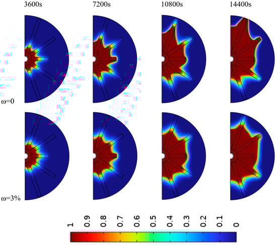 Figure 10 and Figure 11 show the influence of nanoparticle concentrations on the contours of MVF and temperature for two weight fractions of 0% and 3.0%. It is interesting that the melting front extends more uniformly in the presence of GNPs compared to the case with no GNPs. For example, the edge of the top fin (t = 14,400 s) is completely melted when ω = 0, whereas a fair portion of the top fin is still in the solid region when ω = 3.0%. This could be due to a pure PCM’s lower dynamic viscosity, which results in a stronger natural convection circulation. Moreover, attention to the temperature contours shows the heated surface and its neighbor regions are generally at a higher temperature when ω = 3.0% wt compared to the case of ω = 0%. This observation agrees with the average surface temperature, i.e., Tavg − Tf, noted in Figure 9.