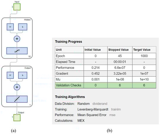The structure of the utilized ANN and the applied settings. (a) the structure of the ANN with a hidden layer and input and output layer. (b) the training parameters and convergence criteria.