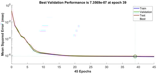 The details of the training setup are reported in Figure 12b. The sample data were randomly divided into 15% test, 15% validation, and 70% train data. Figure 13 shows the performance history for the train, test, and validation data. As seen, epoch 39 provides the best validation data; hence, the ANN after 39 training epochs was adopted for further simulations. Figure 14 provides a histogram for the error distributions. The figure divides the range of the predicted errors into 20 intervals (bins), and it then shows the number of samples for each bin. As seen, the error range for the prediction of MVF is quite small. Most of the samples were placed at the center with an error next to zero. Only a few samples were placed on the edges of the figure with an absolute error of 0.0063 or lower. Finally, Figure 15 depicts the regression data for the training, test, validation, and all cases. The results show an excellent R-value next to unity. There is an excellent match between the target and predicted MVF values. Only a few sample data next to the origin show a slight error. These data are related to the initial melting when the storage unit has strong conduction heat transfer gradients. The initial temperature gradients vanish after a few minutes, and the neural network recovers its full accuracy.