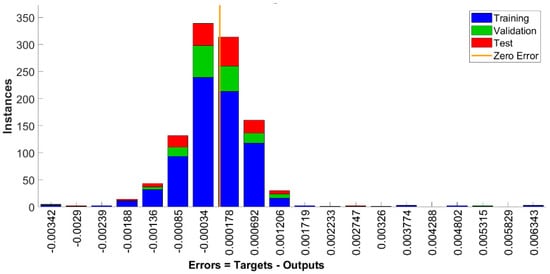 Error histogram with 20 bins for the training, test, and validations. Error ranges between −0.0034 to +0.0063. Most samples were predicted with a tiny error next to zero. There are only a few samples’ data with an absolute error of about 0.0063.