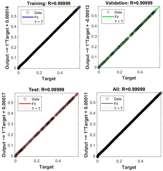 Regression reports for the training, validation, test, and all data. The R-value for each case is reported above each subfigure.