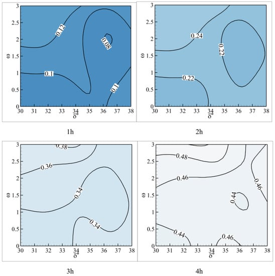 Each numerical experiment takes a long time (see Table 2). Thus, exploring the design space is computationally expensive. Hence, the simulated neural network was used to produce a map of melting behavior as a function of the design parameter of angle (δ) and nanoparticles fraction (ω). In order to produce these maps, the trained ANN was simulated for the angle in the range of 30° to 38° with an interval of 0.25°, whereas the nanoparticles fraction was changed in the range of 0 to 3 with an interval of 0.1. Thus, for each contour, 1023 simulations were performed by the ANNs. The results for each hour are reported in Figure 16. After one hour of the melting process, most melting (MVF = 0.12) occurs for a case with the highest nanoparticles fraction (1.8 < ω < 3) at an angle in the range of 30° < δ < 34°. The lowest melting corresponds to an angle of 36° and a nanoparticles fraction of about 2%. In the second hour of the melting process, the best melting (MVF = 0.24) occurs in the range of 1.7 < ω < 3 and 30° < δ < 34°. Angles higher than 35° are not suitable. For the third hour, the maximum melting (MVF = 0.38) can be observed for the highest nanoparticles fraction (ω ≈ 3) and an angle of δ ≈ 33.5°. A high nanoparticles fraction and low angle provide a fair MVF = 0.36. For high angles and low nanoparticles fractions, the MVF drops to 0.34. For the fourth hour, the maximum MVF = 0.5 takes place for a similar case as the third hour. Thus, it can be concluded that a design with ω ≈ 3 and δ ≈ 33.5° can provide the maximum melting fraction during the whole melting process.
