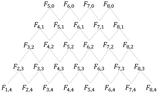 Matrix has rows, which means that there are corresponding functions on when . However, the indexes of these functions may exceed the limit range . There are two solutions for this. One does not generate rows whose indexes surpass the maximum allowed range. The other one disregards these rows because all of their elements equal 0. In order to make the algorithm more understandable, we employ the second solution. In the recursive process, we use these vectors to explain the recursion of matrix in the algorithm.