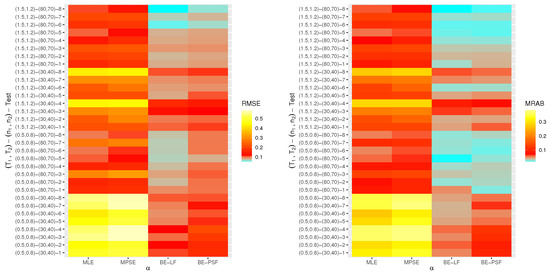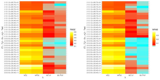 All simulated outcomes are displayed graphically by using the heatmap approach for the RMSEs, MRABs, ACLs and CPs of , , and . The simulation findings are shown in Figure 3, Figure 4, Figure 5, Figure 6, Figure 7 and Figure 8, respectively. Each heatmap has some notation for clarity, such as (i) Bayes estimates via the LF-based method, abbreviated as “BE-LF”; (ii) Bayes estimates via the PSF-based method, abbreviated as “BE-PSF”; (iii) ACI estimates via the LF-based method, abbreviated as “ACI-LF”; (iv) ACI estimates via the PSF-based method, abbreviated as “ACI-PSF”; (v) BCI estimates via the LF-based method, abbreviated as “BCI-LF”; and (vi) BCI estimates via the PSF-based method, abbreviated as “BCI-PSF”. From Figure 3, Figure 4, Figure 5 and Figure 6, we provide the following key findings in terms of the lowest RMSE, MRAB, and ACL values, as well as the highest CP values: