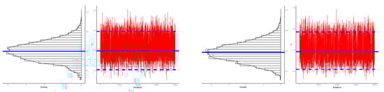 On the other hand, although the FCDs of the two parameters and given by (28) and (29), respectively, are unknown, their plots demonstrate that they are similar to the normal distribution. Therefore, we consider using the Metropolis–Hastings (MH) technique with the normal proposal distribution (NPD) to generate samples from these distributions. The following MH-within-Gibbs sampling steps can be used to obtain samples of and :
