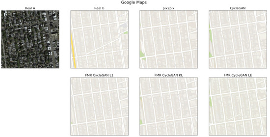 Visual comparison on the first example of paired images from the Google Maps aerial2map task (denoted as “Real A”, belonging to the source or “left” domain, and “Real B”, belonging to the target or “right” domain). The Proposed FMR CycleGAN with various ground distances (L1 corresponding to (8), KL corresponding to (10), and LE corresponding to (12)) was compared against the baseline CycleGAN and pix2pix methods.