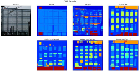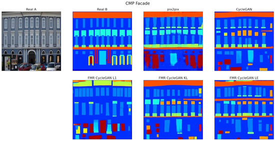 Visual comparison on the second example of paired images from the CMP Facade photo2labels task (denoted as “Real A”, belonging to the source or “left” domain, and “Real B”, belonging to the target or “right” domain). The Proposed FMR CycleGAN with various ground distances (L1 corresponding to (8), KL corresponding to (10), and LE corresponding to (12)) was compared against the baseline CycleGAN and pix2pix methods.