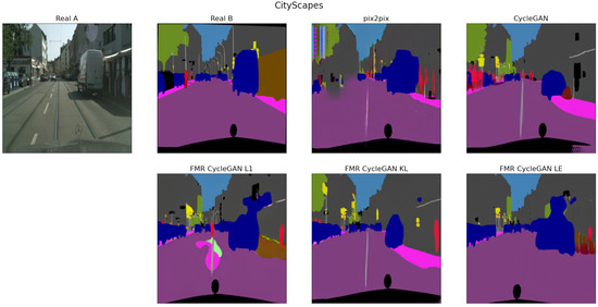 Visual comparison on the first example of paired images from the CityScapes photo2labels task (denoted as “Real A”, belonging to the source or “left” domain, and “Real B”, belonging to the target or “right” domain). The Proposed FMR CycleGAN with various ground distances (L1 corresponding to (8), KL corresponding to (10), and LE corresponding to (12)) was compared against the baseline CycleGAN and pix2pix methods.
