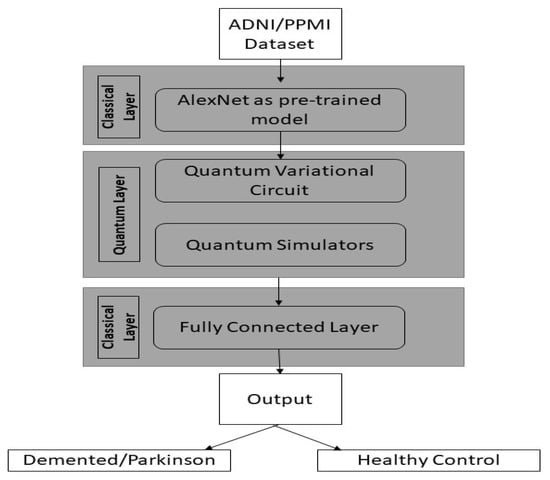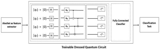 The flowchart for the proposed method is shown in Figure 2 in which low-level and high-level features are extracted using the AlexNet model and the classification task is performed by a fully connected layer. The quantum circuit is connected between the feature extraction layers and classification layers to construct the dressed quantum circuit as shown in Figure 2. This dressed quantum circuit is trained with an MRI dataset to classify the brain disorder using MRI scans.