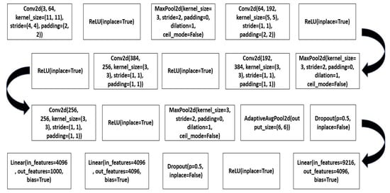 A convolutional neural network (CNN) has three main blocks: convolutional layers, and pooling layers followed by a fully connected layer. The image is given as input to the convolution layers to take the pixel value from the image data and then convolve this with learnable filters to produce a feature map. Pooling layers are used as a dimensionality reduction technique and reduce the dimensions of the given feature maps. Lastly, a fully connected layer is used as a classifier to yield an output vector. It is designed to hold and use the information between pixel values when it takes two- or three-dimensional input images. Given the efficiency and performance of the model, we have chosen the AlexNet model to extract the features and classify the output. Training the AlexNet model requires less computation and it reduces the training time on a large dataset with improved accuracy. The architecture of the AlexNet CNN model is presented in Figure 3.