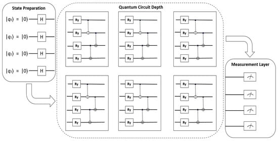 In this work, we have trained the brain disorder dataset on the AlexNet–quantum learning method. The Quantum learning method is implemented using quantum variational circuits and this approach has shown remarkable results in image classification and detection and improved the challenges of the classical learning method. The variational quantum circuit has three main parts as shown in Figure 4. First is the state preparation layer, in which the quantum data is initialized and embedded into the quantum state to process the information. To transform the quantum data into a superposition state and entanglement state, we use various quantum gates such as the Hadamard gate, Rotational gates, and CNOT gates. The second is the variational circuit which entangles the quantum data by utilizing rotational and CNOT gates. The quantum circuit depth is set to six and which means there are six layers of rotational and CNOT gates as shown in Figure 4. We can build various variational circuits using different quantum gates to solve image classification tasks. Lastly, we use the measurement layer to collapse the quantum data into a classical state. A detailed explanation of these layers is given below.