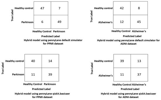 where is a true positive that accurately classifies the brain disorder and is labeled with AD and PD, is a true negative that accurately discriminates the normal case and is labeled with healthy control, is a false positive that inaccurately classifies normal control and is false negative that inaccurately determines PD and AD. The confusion matrix for the proposed AlexNet–quantum learning model is presented in Figure 5 for the AD and PD datasets.