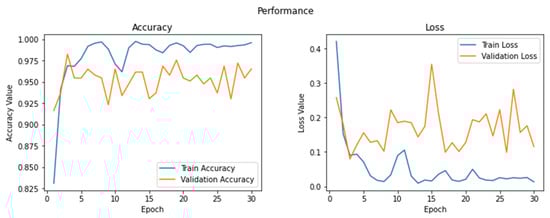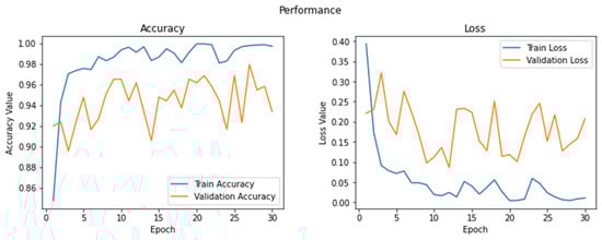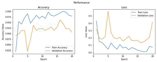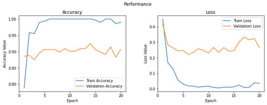 The training and validation accuracy and training and validation loss concerning epochs for AD detection on the proposed model is illustrated in Figure 6 whereas the graphical representation of training and validation accuracy and training and validation loss concerning the number of epochs for PD detection on the proposed model is in Figure 7.