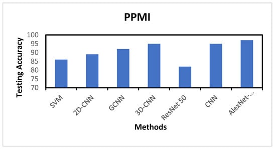 For computer vision task analysis, machine learning models produced remarkable results in recent years. Various works have been employed for the binary and multi-classification of brain disorders. Initially, machine learning models have been implemented for the classification of brain disorders using neuroimaging data. In [9,10,11,12] they used different machine learning algorithms for the binary classification of AD. They extracted features using different techniques such as least absolute shrinkage, selection operator, and radial-based function support vector machine from T1 sequence MRI and utilized SVM as a classifier to yield 85% to 90% accuracy. These classifiers are trained on diffusion tensor image features and entropy features. In [13] they examined the resting state fMRI images taken from the ADNI dataset and trained this dataset on the SVM algorithm by using multiple kernel learning techniques to identify AD. Similarly, refs. [14,15,16] SVM algorithm is also trained on PET, MRI, and FDG-PET imaging modalities to perform binary classification of AD. Recently, deep learning techniques have been implemented to perform binary and multiclassification of AD. Generally, CCN algorithms are trained and tested using generic datasets downloaded from PPMI and ADNI. In [17] they created a CNN model based on leaky rectified linear unit and max pooling which is employed on MP-RAGE imaging modality on the local dataset to perform the classification and to provide an effective diagnosis of AD.