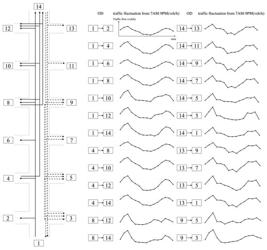 This study is based on the multi-scenario method, where scenarios represent possible traffic conditions. In a scenario, each approach’s traffic volume and other parameters are constant. The principle of this method is to express the fluctuation of traffic flow as a finite number of discrete traffic scenarios, , and their occurrence probability, , to form the traffic scenario set S.