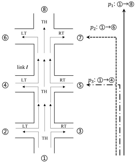 We define local path as the inflow at the upstream intersection and the outflow at the downstream intersection. As shown in Figure 3, there are three turns at each intersection (TH, LT, and RT); therefore, 24 paths can be formed for outbound. Similarly, there are 24 paths in the opposite direction (inbound).