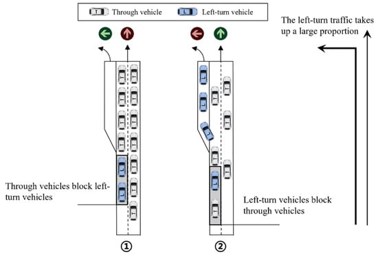 According to the MAXBAND model, the objective function is to maximize the bandwidth of and its opposite direction path. The result is that when green time is allocated, the through phase of each intersection receives more signal resources. It is worth noting that if the left-turn flow at the downstream intersection accounts for a large proportion , the MAXBAND model results in less green time allocated to the left-turn flow. As shown in Figure 4, under uneven signal resource allocation, two scenarios of left-turn and through traffic flow congestion seriously affect traffic efficiency.