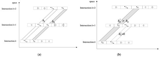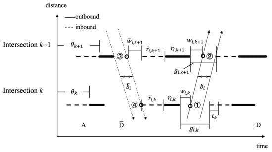 where is the duration before (after) the green bands for outbound (inbound) path i at intersection k, and is the red time at path i. Equations (4) and (5) limit the green bandwidth within the available green time.