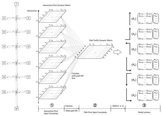 Figure 7 shows the generation process uncertainty flow scenarios. In the first step, we generate hundreds of scenarios with uncertain traffic flow based on field survey data. For each traffic scenario, we obtain one intersection flow matrix. Since our goal is the multi-path progression, in the second step, the OD information of the multi-path is calculated according to the intersection flow matrix, and the uncertainty of intersection flow is converted into the uncertainty of the path flow, thus, we obtain the path traffic scenario matrix. Finally, the solution of the model is obtained through a genetic algorithm.