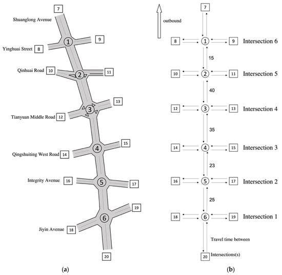For this experiment, we select six intersections of Shuang Long Avenue in Nanjing as the research area. The distribution and connection status of the intersections are shown in Figure 8a, and the distribution of travel times between intersections is shown in Figure 8b. The travel times between intersections from Intersection 1 to 6 are 15 s, 40 s, 35 s, 23 s, and 25 s, respectively.