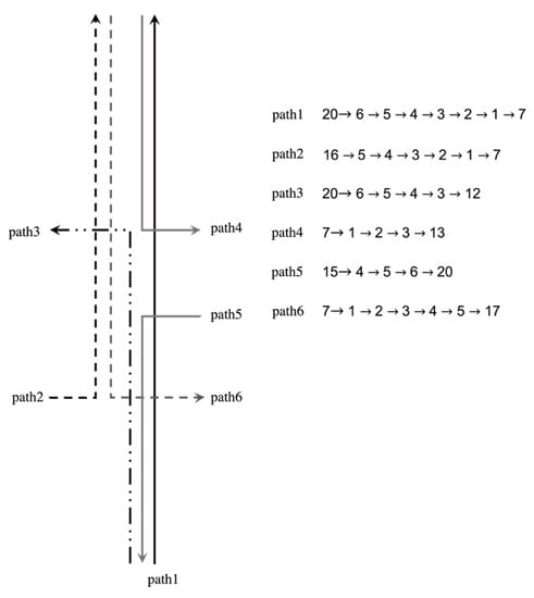 Figure 9 shows each intersection and node that the path passes through. Six paths are selected as the research object, and the OD nodes of the six paths are as follows: Path 1, 20→7; Path 2, 16→7; Path 3, 20→12; Path 4, 7→13; Path 5, 15→20; Paths 6, 7→17. The directions of Paths 1, 2, and 3 are outbound, and the directions of Paths 4, 5, and 6 are inbound.