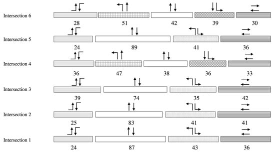 Multi-path signal progression provides multi-path travel belts both for through and turning path flows with significant traffic. Arsava et al. established the OD-NETBAND model which considered the origin and destination (OD) of the arterial vehicle paths and optimized the bandwidth according to OD data [14]. Lin et al. put forward the INTEBAND model (comprehensive green band model), which ensured the formation of variable green bands and coordinated the operation of social and public transport vehicles on the arterial [15]. However, the accuracy of the existing sensors needed to be improved, and the OD data were challenging to obtain. Based on this, Chen (2021) [12] used left-turn counting data, which were easier to obtain, to ensure the effectiveness of the green band and to overcome data acquisition difficulties by disassembling the path into a combination of multiple local bands. However, the assumptions of a path traffic calculation model can lead to deviations between calculated and actual traffic.