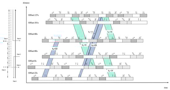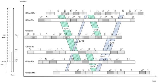 When considering multi-path progress with time cycle constraints, we can substitute Equation (6) in the MAXBAND model into multi-path. In addition, it is also necessary to consider that integer loop constraints in the original model may lead to invalid bandwidth for some paths. The time cycle constraints of multi-path improvement are given as follows (the progress of outbound green bands from point ① to point ② of Figure 6):