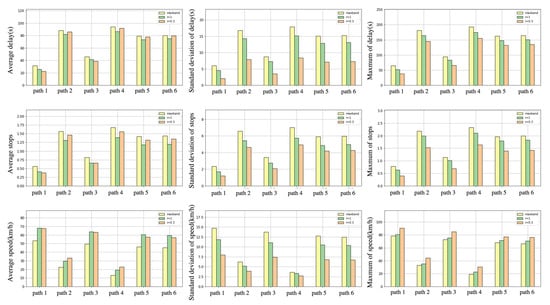 To evaluate the traffic operation of different models, SUMO [25] is selected as the simulation software in this study, with the model solution results as the simulation input, and the final output results are shown in Table 3. The changes in operating parameters of the three models in each path are shown in Figure 13.