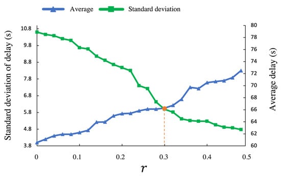 The efficiency-stability coefficient r determines the model’s preference for efficiency and stability under the condition of emphasizing model stability (0 ≤ r ≤ 0.5). As shown in Figure 14, the influence of the efficiency stability coefficient on the mean and standard deviation of the model delay is discussed. With an increase in , the standard deviation of delay increases while the average delay decreases. Overall, the inflection point of the delay standard deviation curve appears at . When , the rising rate of delay standard deviation is fast, which means that the stability of the model is gradually deteriorating, and the decreasing speed of efficiency is relatively stable. To maximize stability without losing overall efficiency, the in the previous experimental scenario is taken as 0.3.