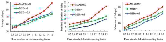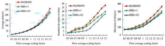 To explore the influence of a change in the flow mean value on the delay of each model, and to control other parameters to remain constant, according to Table 2, multiply the flow mean value of each direction by the scaling factor, and the scaling range is 0.5~1.5. The results are shown in Figure 15. Overall, an increase in traffic volume causes the overall operation efficiency and stability of each control scheme to be worse, and the slope of the mean and maximum delay increases significantly. With an increase in traffic volume, the distance between the traditional MAXBAND model and the MSD- model in the standard deviation of delay and the maximum delay value gradually increases. It shows that when the flow is large, the stability of the operation efficiency of the traditional control scheme gradually becomes worse, and it is difficult to resist the change in the flow. However, the MSD-r = 0.3 model has the slowest growth rate. It can be concluded that the model is less sensitive to changes in external disturbances than the other models, which shows that the model has good stability.