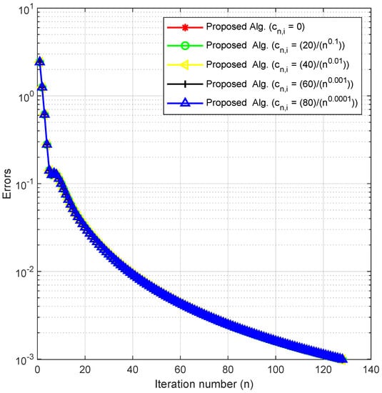 Using as the stopping criterion, we plot the graphs of against the number of iterations for each The numerical results are reported in Figure 1, Figure 2, Figure 3 and Figure 4 and Table 1.