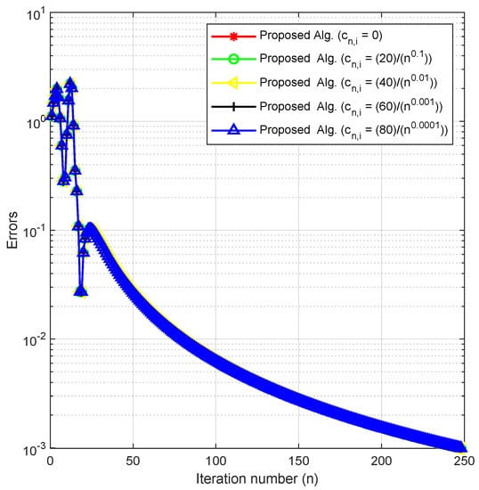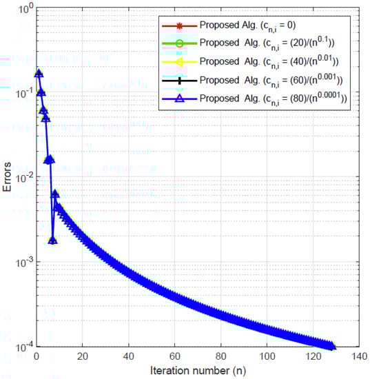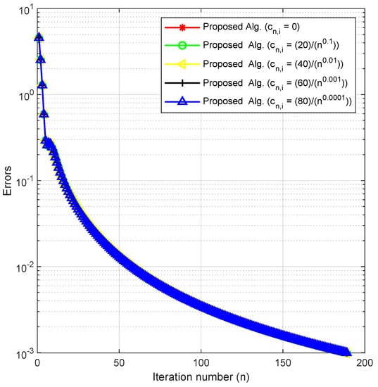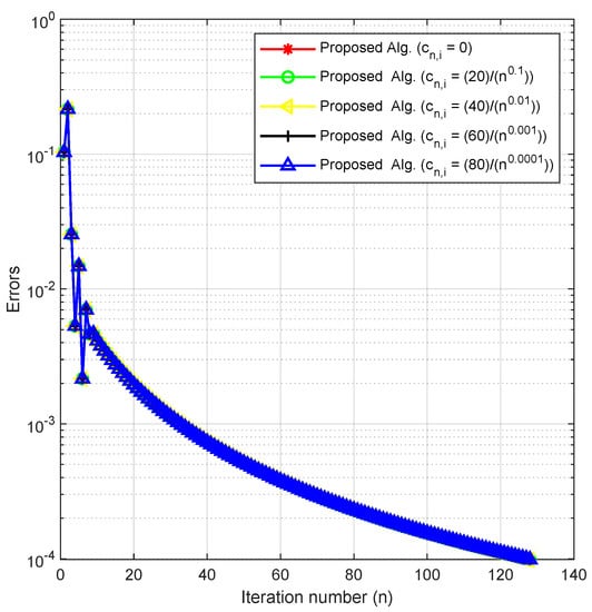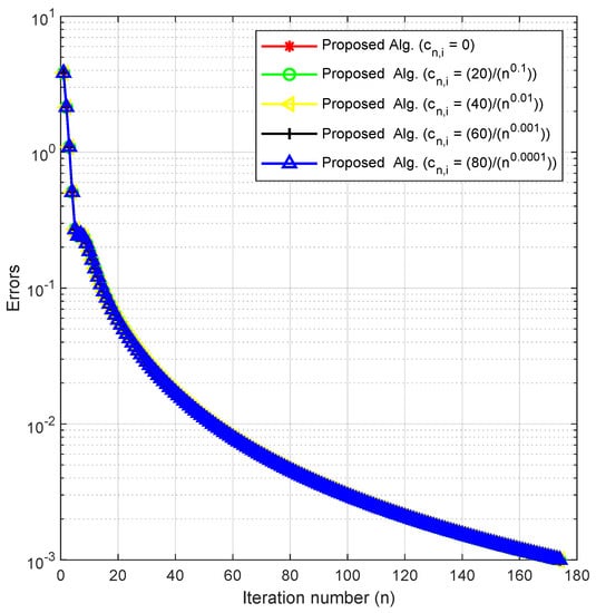 Using as the stopping criterion, we plot the graphs of against the number of iterations in each case. The numerical results are reported in Figure 7 and Figure 8 and Table 3.