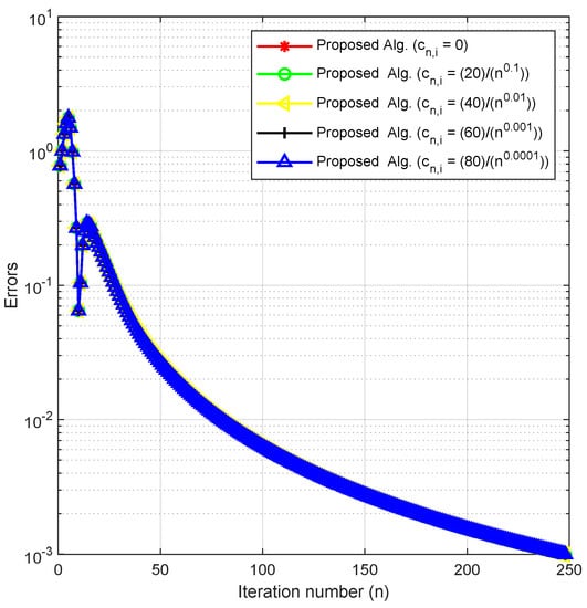 By using different initial values, cases of m and varying the key parameter in Experiments 1–3, we obtained the numerical results displayed in Table 1, Table 2 and Table 3 and Figure 1, Figure 2, Figure 3, Figure 4, Figure 5, Figure 6, Figure 7 and Figure 8. In Figure 1, Figure 2, Figure 3 and Figure 4, we considered different initial values and cases of m with varying values of the key parameter for Experiment 1 in As observed from the figures, these varying choices do not have a significant effect on the behavior of the algorithm. Similarly, Figure 5 and Figure 6 show that the behavior of our algorithm is consistent under varying initial starting points and different values of the key parameter for Experiment 2 in Likewise, Figure 7 and Figure 8 reveal that the behavior of the algorithm is not affected by varying starting points and values of for Experiment 3 in From these results, we can conclude that our method is well-behaved since the choice of the key parameter and initial starting points do not affect the number of iterations or the CPU time in all the experiments.