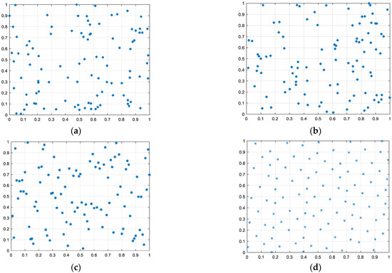 The commonly used population initialization methods include random initialization method, population initialization method based on chaotic mapping, population initialization method based on reverse learning and population initialization method based on good point set theory. The random initialization method is simple in principle and easy to implement. Many references [19,38] use this method to generate the initial population and achieve good results. Chaotic mapping has the characteristics of randomness, ergodicity and regularity. Many scholars often use chaotic mapping to generate an initial population. In 2005, Yu et al. [39] took the lead in using chaotic mapping to generate an initialization population in GA, which effectively improved the optimization accuracy of the algorithm. Since then, many scholars have used chaotic mapping to generate initialization populations [40,41,42]. There are more than ten kinds of chaotic mappings. The chaotic mappings commonly used to generate the initial population are logistic mapping and tent mapping. The initial population generated by logistic mapping is mainly distributed at both ends of the search space, and the middle region less so. If the optimal solution is in the middle region of the search space, the convergence speed of the algorithm will be reduced. Tent mapping has better ergodicity and uniformity than logistic mapping, so tent mapping is often used to generate the initial population. In 2005, Tizzoosh et al. [41] proved that both the current solution and the elite individual have a 50% probability that they are far from the optimal solution compared to the reverse solution. In 2008, Rahnamayan et al. [40] used the population initialization method based on reverse learning to generate the initial population and achieved good results. Good point set theory is a point set generation method proposed by Professor Luogeng Hua [37]. It is mathematically proved that the point sets generated by good point set theory are evenly distributed in unit space. There are three major ways to generate point sets in the unit cube: exponential sequence method, circular domain method and square-root sequence method. Because the number of digits after the decimal point that can be displayed by the computer is limited, when the dimension is greater than 35, the decimal part of the number generated by the exponential sequence ek is 0, and the exponential sequence method is invalid. Therefore, the initial population can be generated using the split-circle domain method or the square-root sequence method.
