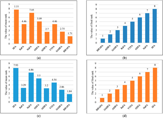 To verify that the performance of the IHFAPA algorithm is better than other FAs and other intelligence optimization algorithms, 28 30-D and 50-D test functions in CEC 2017 are selected and four practical engineering optimization problems are selected. Two groups of experiments were designed to verify the superiority of the IHFAPA algorithm performance. The experiment that uses 28 30-D and 50-D test functions in CEC 2017 to verify the superiority of IHFAPA performance is called the first combination experiment. The experiments to verify the performance advantage of the algorithm using four practical optimization problems commonly used in engineering are called the second set of experiments. The results of the first combination experiment show that the solution quality of IHFAPA is significantly better than seven other improved FAs and seven other intelligence optimization algorithms, which verifies the effectiveness and superiority of IHFAPA. The second set of experimental results show that the solution quality of IHFAPA is better than the other 14 comparison algorithms, and the effectiveness and performance advantages of the algorithm in practical problems are verified.